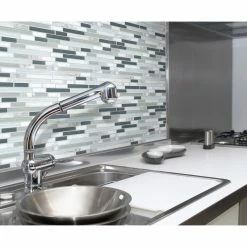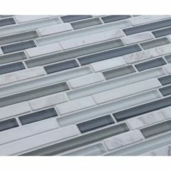 Bliss Iceland random strip glass and marble mosaic tiles. A cool mix of dark blue gray, white, and light gray glass strips combined with a nice bright white marble blend together in this popular random strip mosaic. This is a very popular tile with homeowners for use in a kitchen backsplash or accent strip for your bathroom.