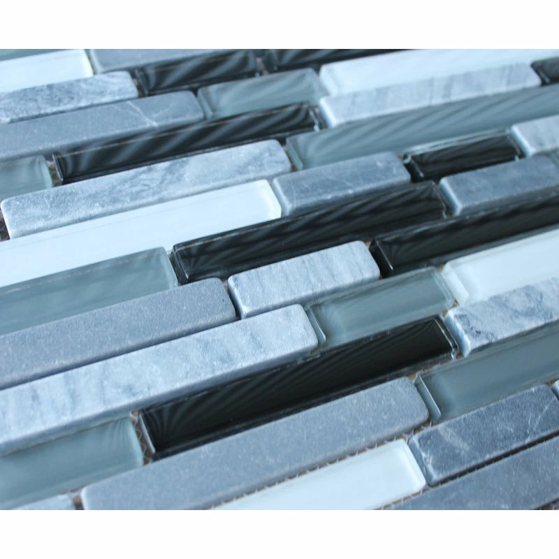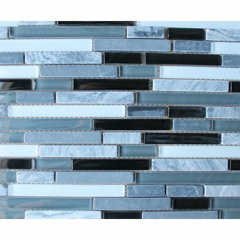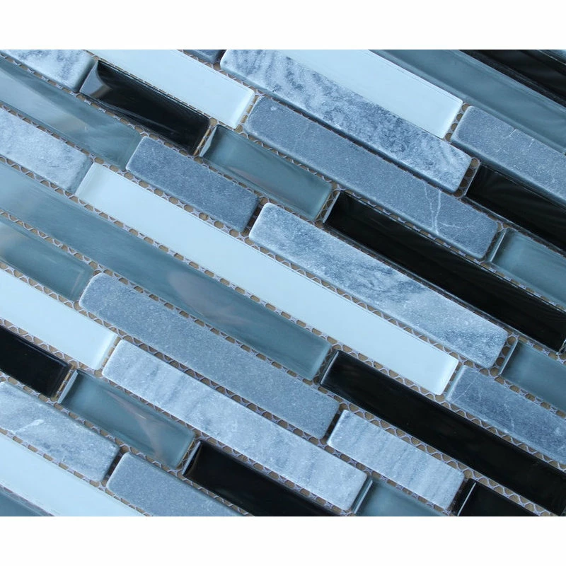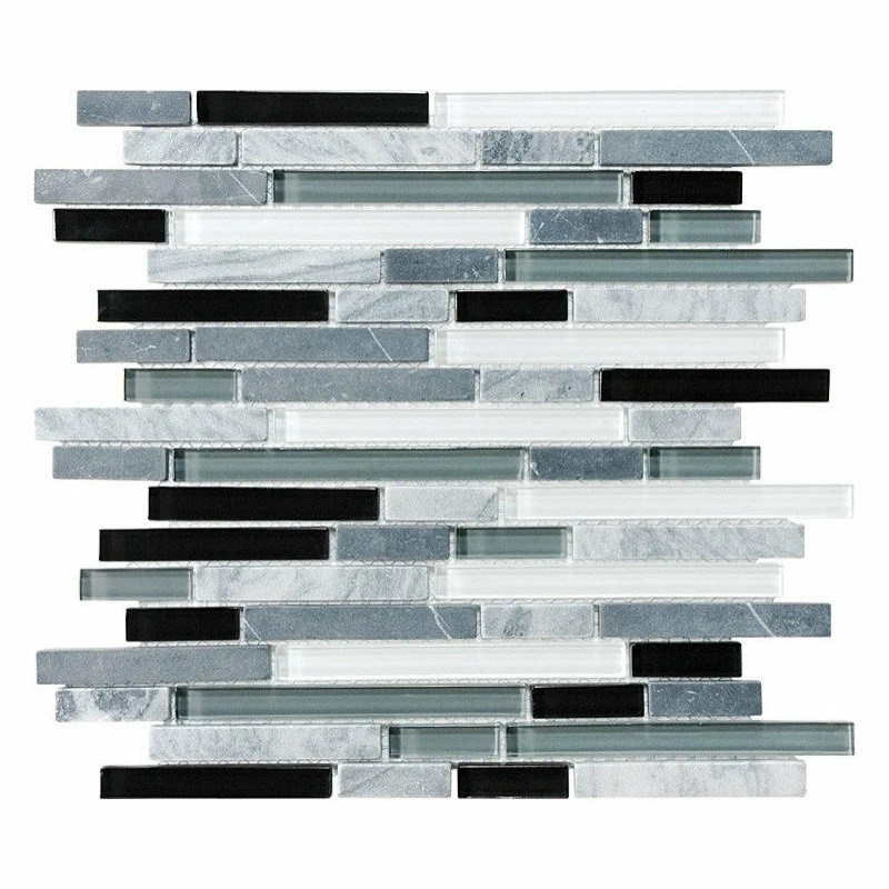 A well balanced blend of black, gray and white glass interlaced with a nice mix of gray stone mosaic strips. A great choice for a kitchen or bathroom in need of a nice cool neutral tile.