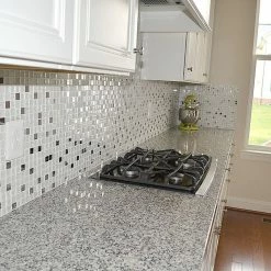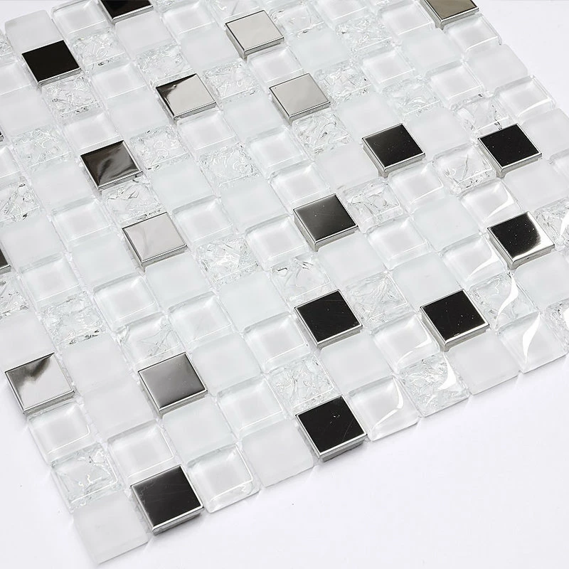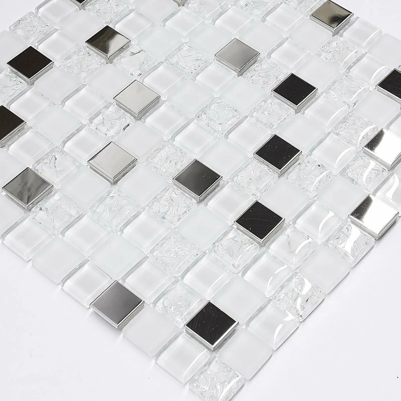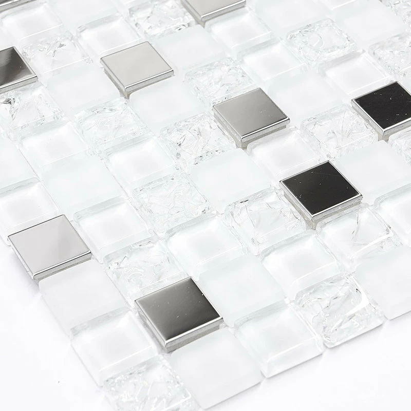 White glass tiles mixed with metal inserts. White color kitchen backsplash tile.