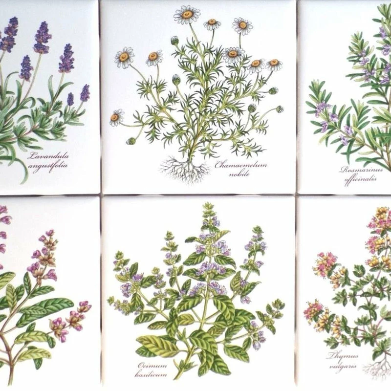 Salvia officianlis,(Common Sage) Rosmarinus officinalis, (Rosemary) Thymus vulgaris, (Garden Thyme) Lavandula angustfolia, (English Lavender) Chamaemelum nobile, (Roman Chamomile) Ocimum basilicum (Basil)