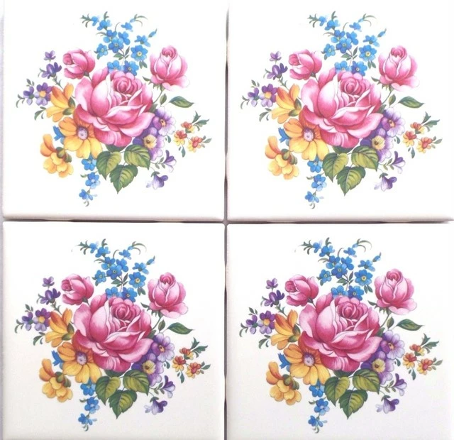 - Set of four pink blue lavender and yellow rose ceramic tiles