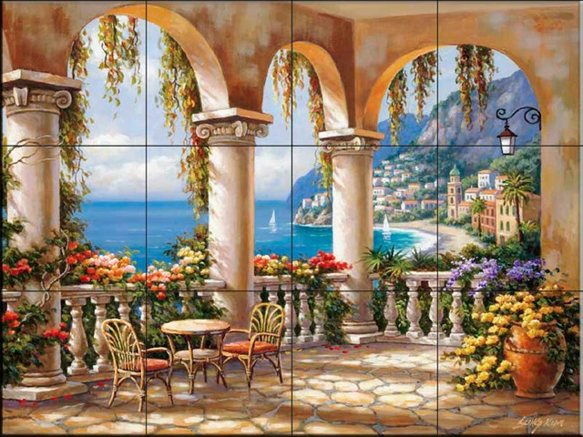 Our waterview tile murals are great for your kitchen backsplash wall tile project. Water view tiles are also commonly used in bathroom tile projects. Waterview scene tiles include tiles with beach scenes, ocean theme tiles, Tuscan tile murals, tile murals of Greece and Mediterranean tile mural scenes.