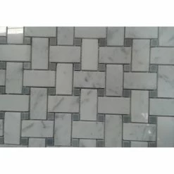 - Italian Carrara White Marble Polished Basketweave Mosaic Tile with Grey Dots.